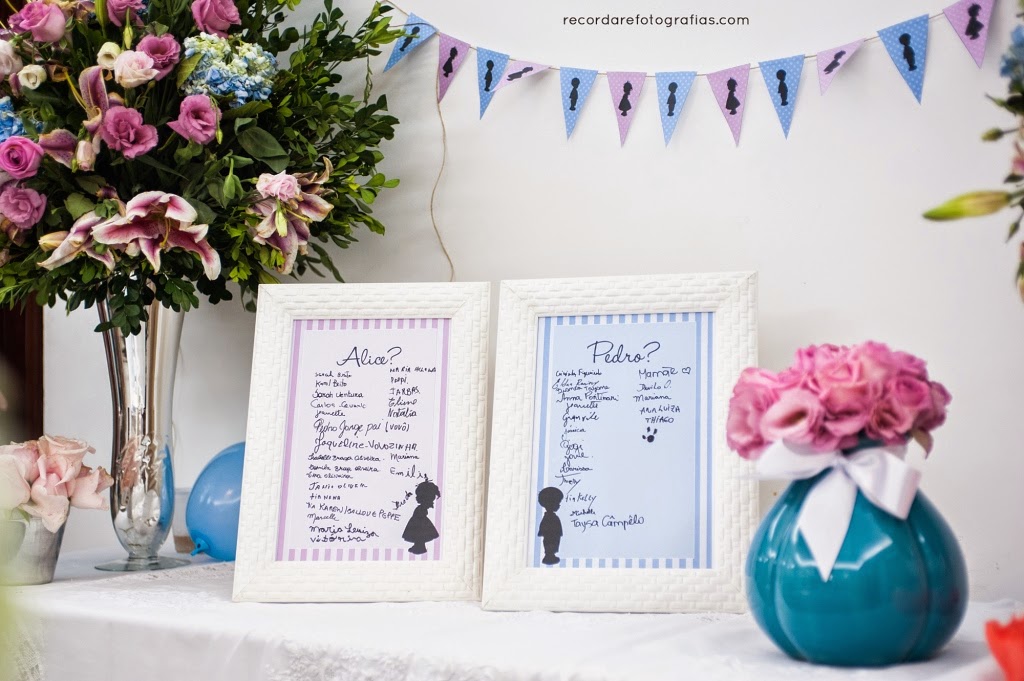 Brincadeira da adivinhação: Todos fazem as apostas e fica muito divertido saber quem acertou! Algumas idéias de fazer a adivinhação, escrever o nome, colar as cores azul ou rosa com fitas, pregadores.